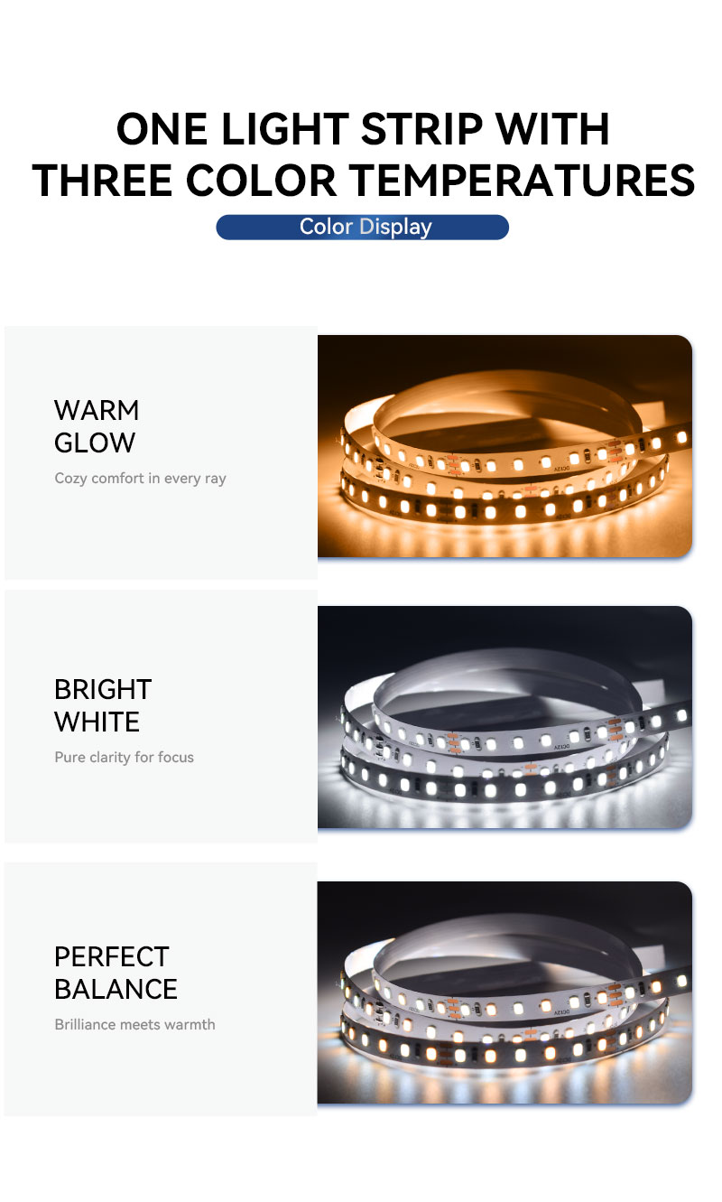 This dual color temperature high brightness, high density and anti-dead bead design LED light strip is a powerful, flexible and reliable lighting solution. It not only provides sufficient light, but also adjusts the light color according to needs, and has excellent durability, making it an ideal choice for modern lighting design.
